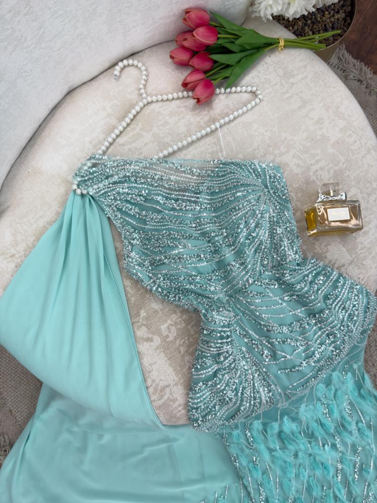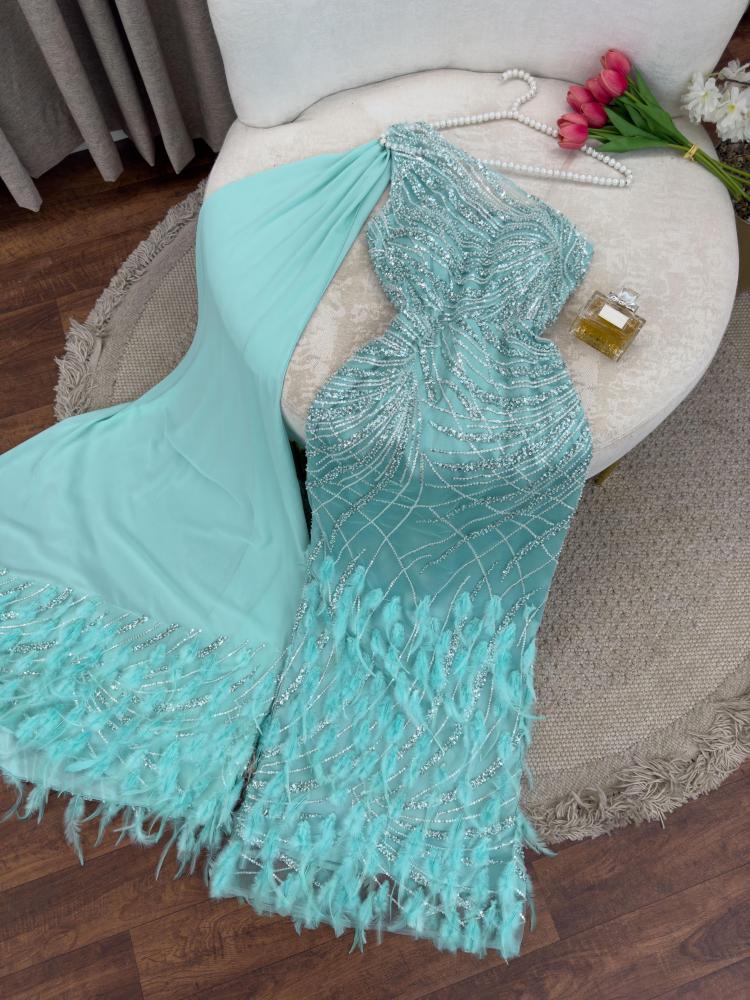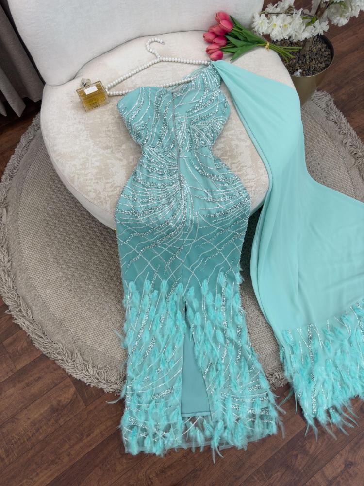فستان تركواز ساحر مصنوع من قماش التل المطرز، ويأتي بتصميم كتف واحد مع شال من الشيفون يضفي لمسة فريدة، ويأتي بتصميم كتف واحد ، تضفي تفاصيل الريش. يعطي هذا الفستان إطلالة مميزة وفريدة.
